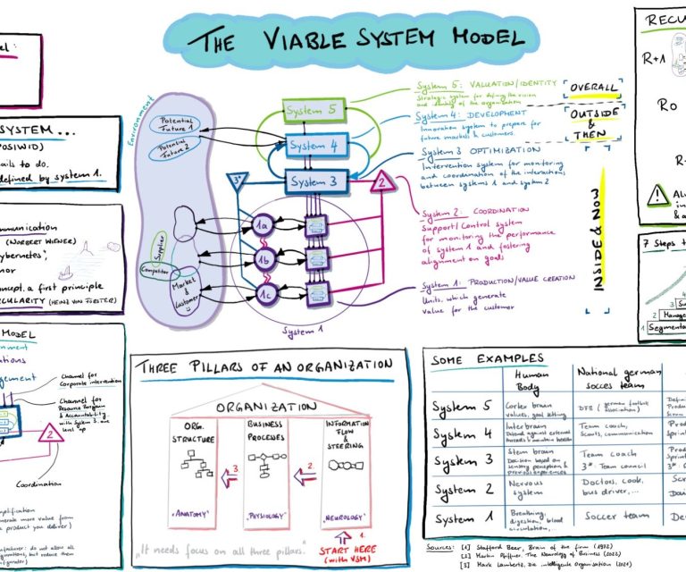 Das Viable System Model (VSM) beschreibt Organisationen als lebensfähige, sich selbst steuernde Systeme mit klar definierten Funktionsbereichen, die helfen, Struktur, Informationsflüsse und Entscheidungen so zu gestalten, dass sie in komplexen Umwelten stabil und anpassungsfähig bleiben.